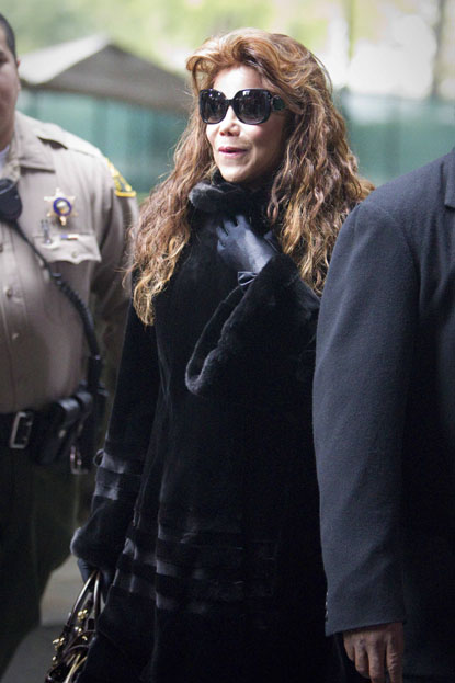 October 25, 2011: La Toya, drenched in black fur, returned to court today, along with siblings Janet and Marlon and her mother Katherine.